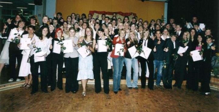 Am 11.6.2005 folgten dann die beiden anderen Teile der Abi - Kampagne: Morgens erhielten die Abiturientinnen (deutlich in der Überzahl) und die Abiturienten von der Schulleiterin in festlicher Atmosphäre ihr ersehntes Reifezeugnis und am Abend klang der wichtige Tag mit einem großen Festball aus, der den Ernst und den Spaß der Gesamt – Kampagne glücklich verschmelzen ließ.