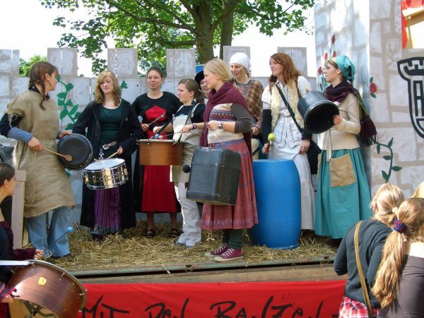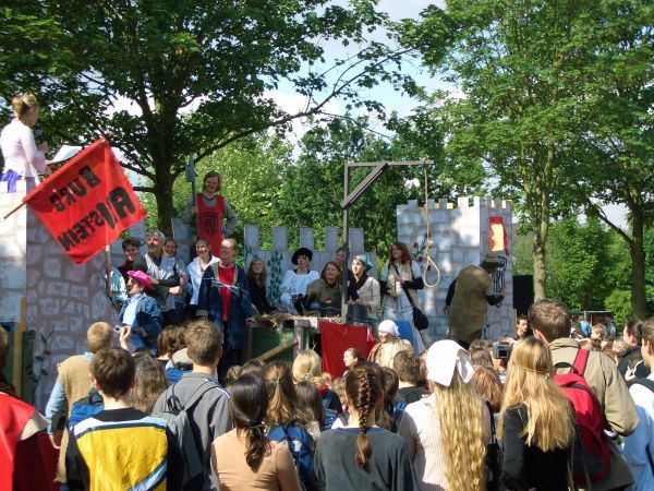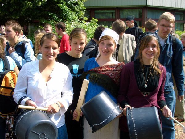 Nachdem der ernste Teil des Abiturs endlich überstanden war, begann am 8.6.2005 die eigentliche Abi – Kampagne: Von der ersten mobilen Burgruine der deutschen Geschichte aus stürmte ein tapferes Abi – Ritterheer das nunmehr feindliche Gebäude finsterer Vergangenheit und nahm alle Verteidiger in scharfen Gewahrsam. Dem befreiten staunenden (Schüler-)Volk bot sich anschließend ein buntes Spektakel mit Ritterkämpfen, Märchenbildern („Schneewitwer und die sieben Wanderhuren“) und einer leicht veränderten Aufführung des „Faust“ (bei dem das sichtbar blonde Gretchen etwas aus der Form geraten war). Zu guter Letzt waren die Sieger aber zur Versöhnung bereit und gewährten ihren ehemaligen Gegnern ein gemeinsames üppiges Versöhnungsmahl im Ballsaal des eroberten Feindgebäudes.