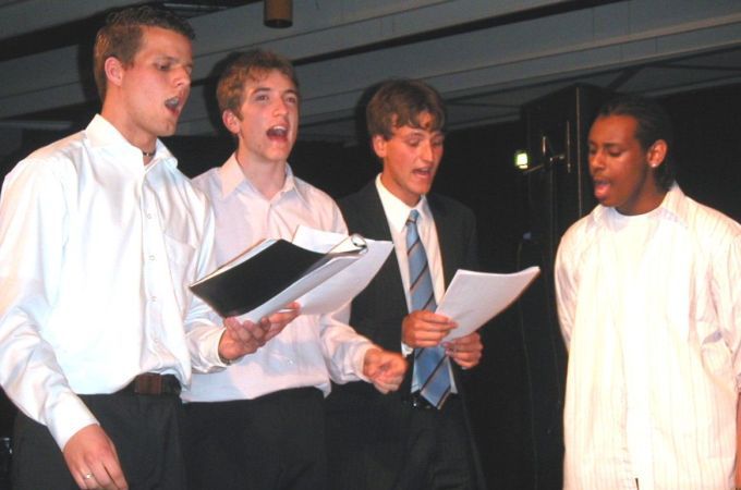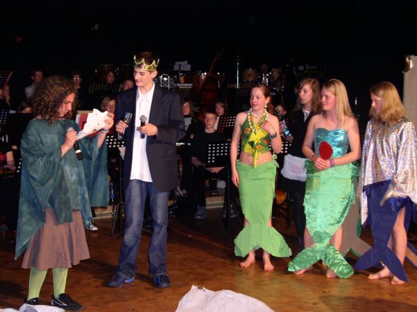 Unter der Leitung der Kapitäne Nonnemann, Busch und Wittbrodt besangen Seeleute von Oberstufenchor, Unterstufenchor, Orchester XXL, Band Fenfire und der Klasse 7e in einem breiten Spektrum an musikalischem und schauspielerischem Können die Seefahrt zu Wasser und zur Luft in Schiffen, Raumschiffen und anderen großen Pötten.