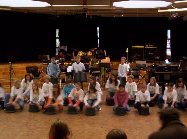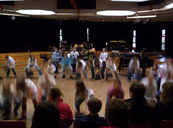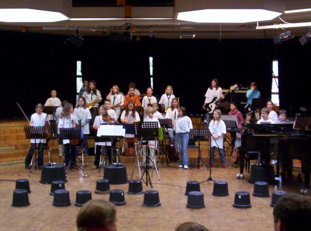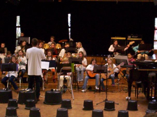 Vor den versammelten Eltern spielten sie ihr seit September 2005 eingeübtes Repertoire von 9 Stücken quer durch etliche Stilrichtungen vom Blues und Rock zur Klassik mit großer Leidenschaft. Unter Leitung ihres Musiklehrers Stephan Busch zeigte das aus einer großen Rhythmusgruppe, einem stark besetzten Bläsersatz und einem kleinen aber feinen Streicherensemble bestehende Klassenorchester sein Können.