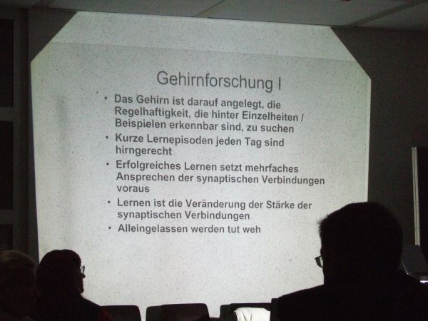 Die Lehrerinnen und Lehrer erhielten in einem Basisvortrag Einblick in die aktuelle Gehirnforschung und holten sich anschließend in drei fachbereichsbezogenen Arbeitsgruppen Tipps und Anregungen für einen abwechslungsreichen und erfolgreichen Unterricht. Thema war dabei vor allem die Erzeugung und Gestaltung von ganz oder teilweise selbstgesteuerten Gruppenprozessen und deren Einfügung in den Unterricht. Im Mittelpunkt standen dabei Methoden, mit deren Hilfe die Schülerinnen und Schüler systematisch üben können, Inhalte zu erfassen, sie zu strukturieren, mit anderen gemeinsam zu bearbeiten und gewonnene Erkenntnisse dann auch in größeren Zusammenhängen darzustellen.