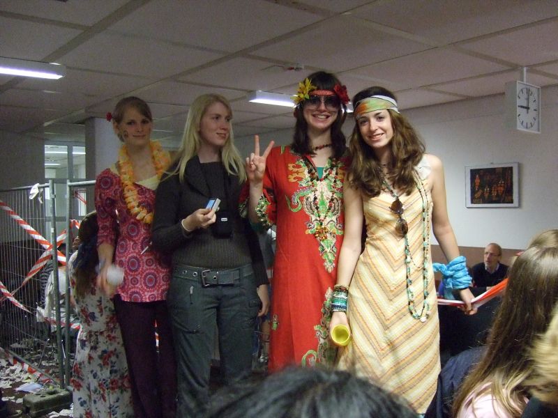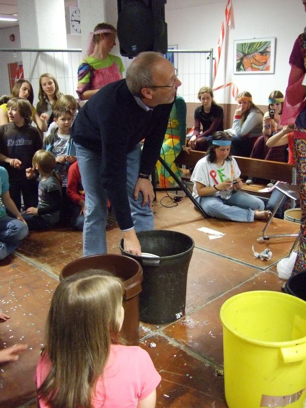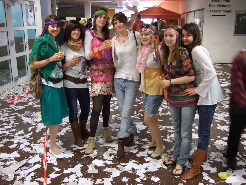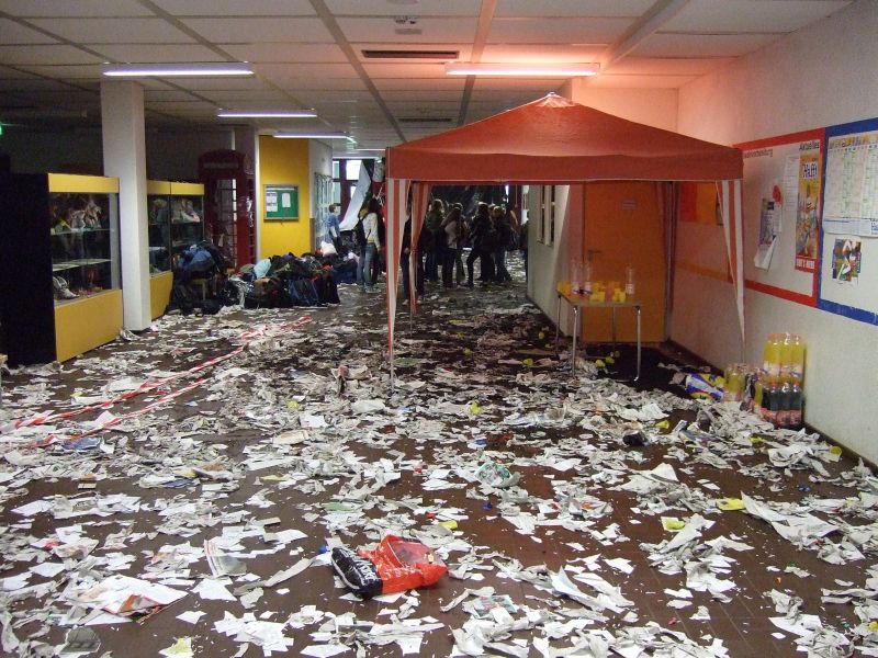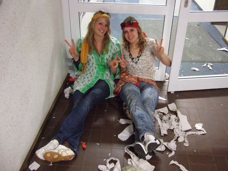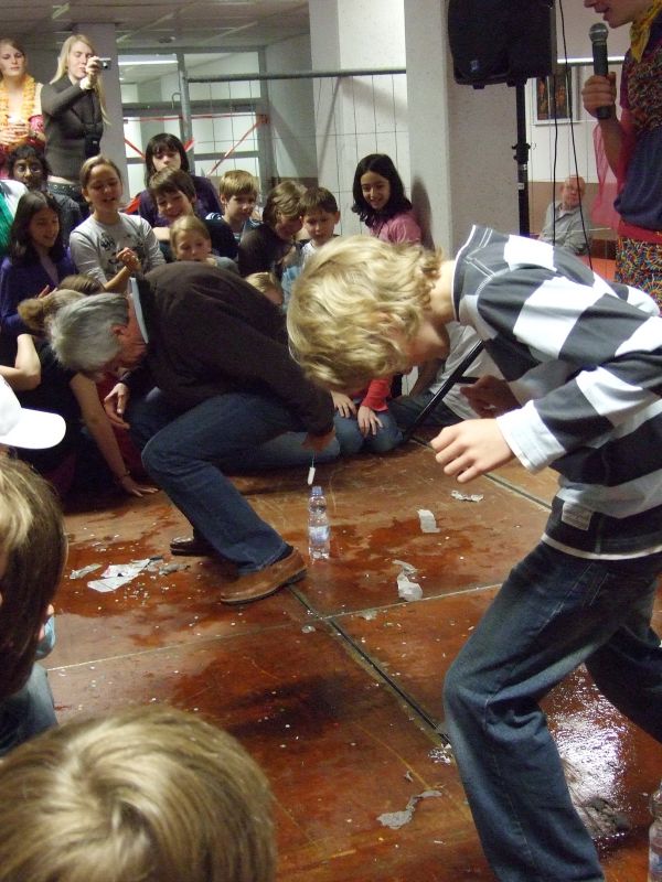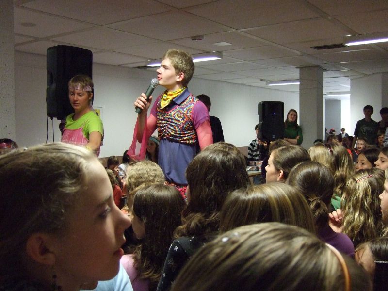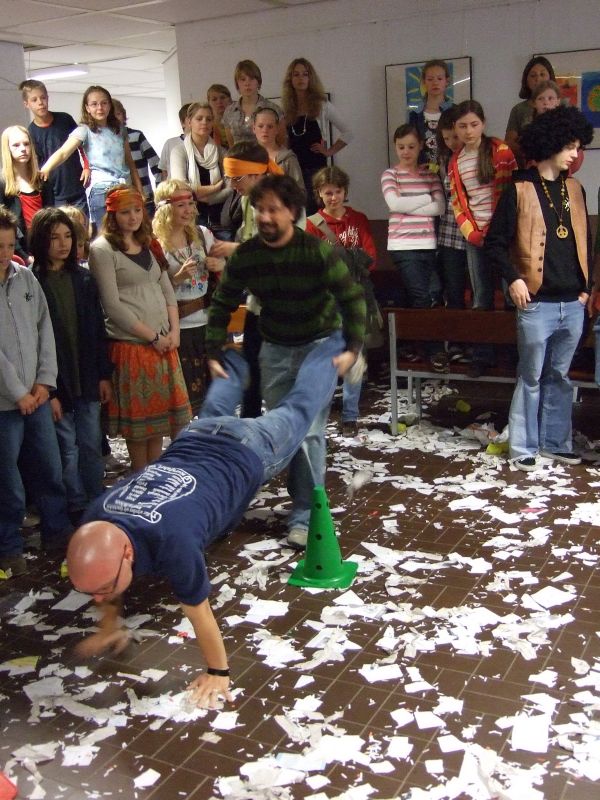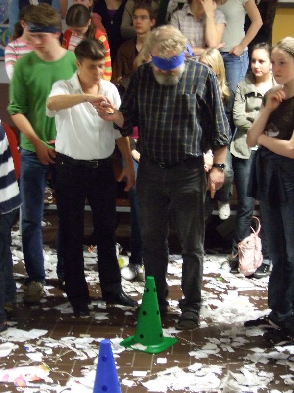 Die Schulgemeinde wurde nicht wie sonst üblich schon vor dem Schulgebäude abgefangen, sondern hineingelassen und in der völlig zugeschnipselten Pausenhalle mit den für diesen Anlass üblichen, die Lehrer demütigenden Spielchen unterhalten: Sie mussten z.B. Quizze überstehen, um die Wette auf den Händen Schubkarre laufen, mit Plastiksieben Wasser aus Eimern schöpfen und mit auf dem Rücken befestigten Tampons gefüllte Flaschen anheben. Verköstigt wurde die Lehrerschar diesmal nicht; vielleicht hatte sie es nicht verdient (?).