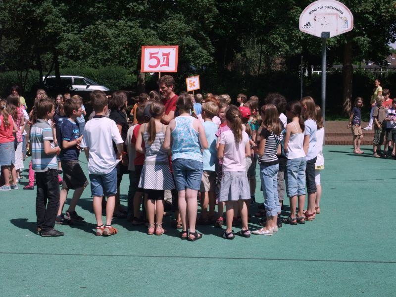 Danach richtete sich dann auch der Verlauf des Festes: Nach der Begrüßung durch die Schulleiterin, Frau Birgitt Beemers, und den Erprobungsstufenleiter, Herrn Dr. Gernot Gilich, und einer musikalischen Einstimmung durch Schülerinnen und Schüler der jetzigen 5er Klassen holten sich die neuen Sextaner bei ihren Paten farbige Bändchen ab, durch die sie bestimmten Klassen zugeordnet wurden. Dann traten die neuen Klassenlehrerinnen und Klassenlehrer mit gleichfarbigen Klassenschildern vor und versammelten ihre „Schäfchen“ bei sich unter ihren Schildern.