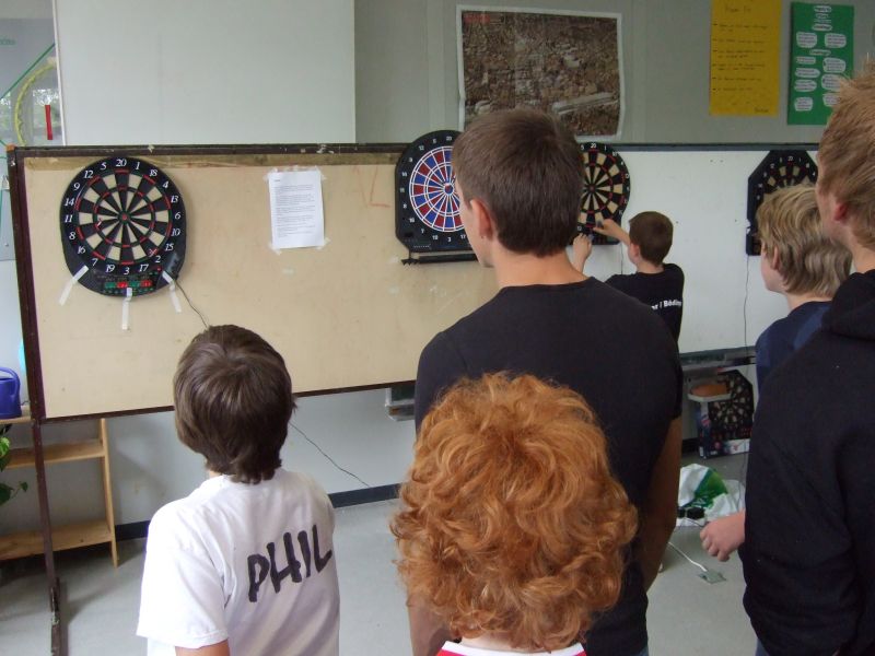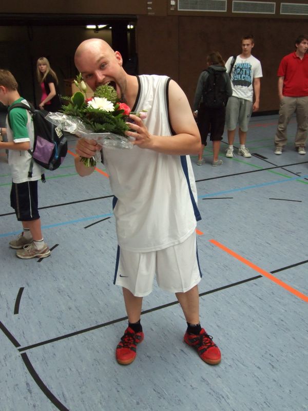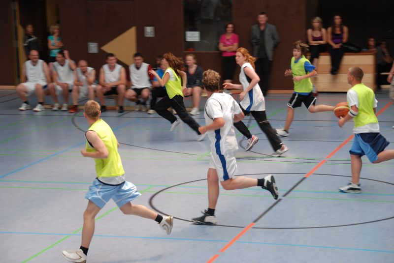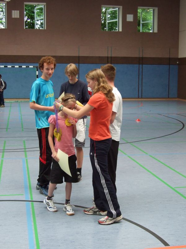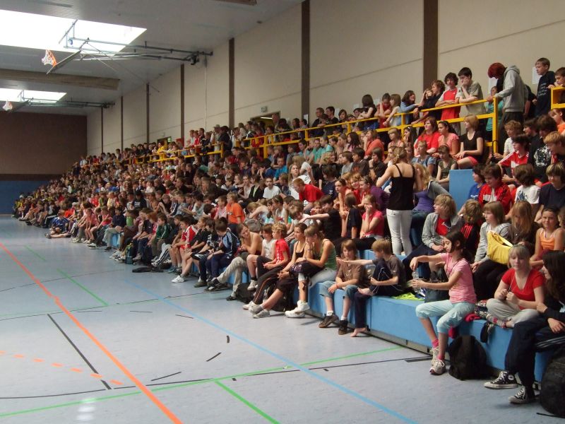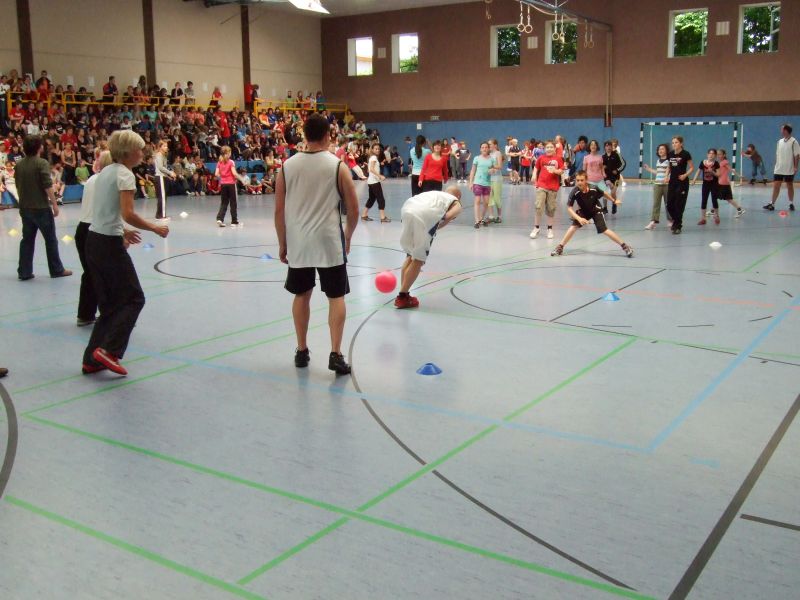 Den Abschluss bildete eine große Gemeinschaftsveranstaltung am Nachmittag in der Turnhalle, bei der verschiedene Schüler - Lehrer - Elternspiele, Tanz - Performences und Siegerehrungen für die Läufe am Vormittag stattfanden. Auch hier war die Stimmung prächtig, wenn auch die Anfeuerungen des Schülervolks etwas einseitig ausfiel, was die Motivation der Lehrermannschaften jedoch nicht beeinträchtigen konnte.