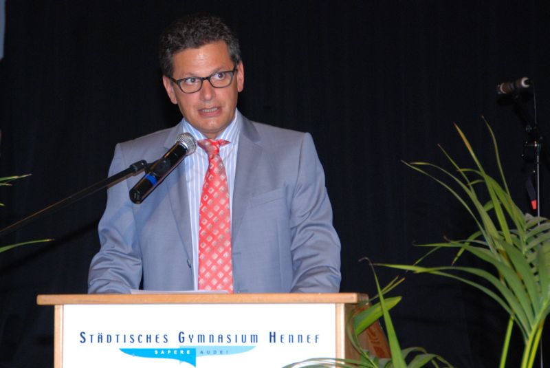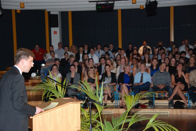 Die Aufforderung, ihre Erfahrungen aus der Schulzeit nicht zu vergessen und für die Zukunft fruchtbar zu machen, war auch die Kernaussage der meisten Abiturreden. Herr Lückner als Stufenleiter ermutigte die Abiturienten, das Ohr an ihre „Schiene der Geschichte“ zu legen. Herr Roth verdeutlichte ausgehend von Parallelen zwischen der Geschichte Harry Potters und der Biografie der Schülerinnen und Schüler die Bedeutung von Freiheit und der daraus resultierenden Verantwortung. Die Abiturientinnen schließlich resümierten ihren bisherigen Lebensweg, indem sie das Rad der Geschichte vom heutigen Tag bis zu ihrer Geburt zurückdrehten.