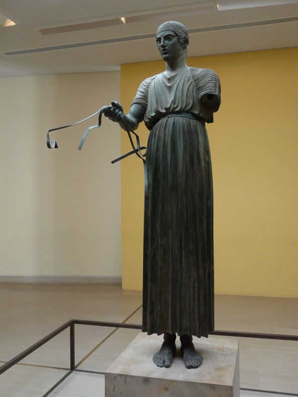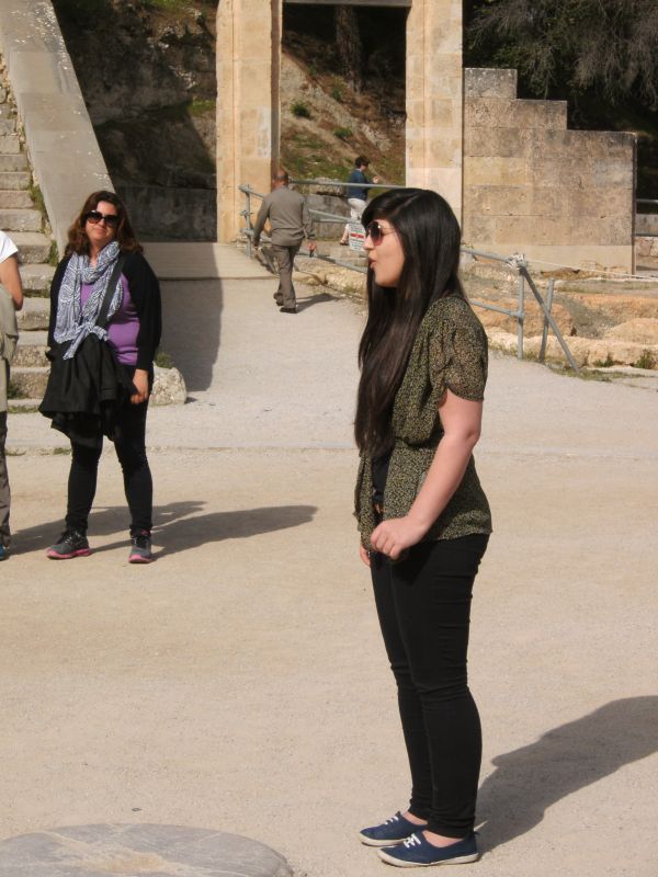Delphi, eine Stadt, die für ihr antikes Orakel bekannt ist, beeindruckt nicht nur in dieser Hinsicht. Nach unserem Aufstieg auf den Hang an den Überresten der über 2000 Jahre alten Kultstätte vorbei blickten wir bei strahlendem Sonnenschein auf ein wirklich schönes Natur-Panorama – für mich das schönste der ganzen Reise! Die relativ gut erhaltenen Ruinen ermöglichten uns eine Vorstellung davon, wie ein solch bedeutender Ort für die Griechen ausgesehen hat, und wir lernten hier, wie überall sonst auf der Reise, eine Menge darüber, wie sie lebten und bauten. Neben der Besichtigung dieser gigantischen Ausgrabungsstätte zeigte uns das dortige Museum, auf welche Weise einzelne Fundstücke von Archäologen zu einem Gesamtbild gefügt und ergänzt werden können. Dazu fällt mir eine bestimmte Rekonstruktion ein, bei der ein Wagenlenker mit Wagen und Pferden zu sehen war. Obwohl von diesen nur wenige Bruchstücke erhalten waren, konnte er vollständig wiederhergestellt werden.