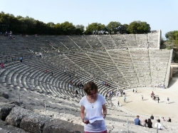 Das Theater in Epidauros ist eines der größten und am besten erhaltenen Theater in ganz Griechenland. Es bietet 14000 Zuschauern Platz und ist berühmt für seine brilliante Akustik. Wenn man in der Mitte des Theaters eine Münze fallen lässt, ist dies tatsächlich bis in die oberste Reihe zu hören, wenn sich das Publikum ruhig verhält. Obwohl das Bühnenhaus des Theaters nicht mehr erhalten ist, finden heute noch in Epidauros Theaterfestspiele statt. Beeindruckend ist die zweckdienliche Architektur: Die Steigung des Theaters ermöglicht jedem Zuschauer, unabhängig von seinem Sitzplatz, einen guten Blick auf den Schauplatz. Zudem hat man als Zuschauer einen phantastischen Blick auf die Hügel der Argolis.