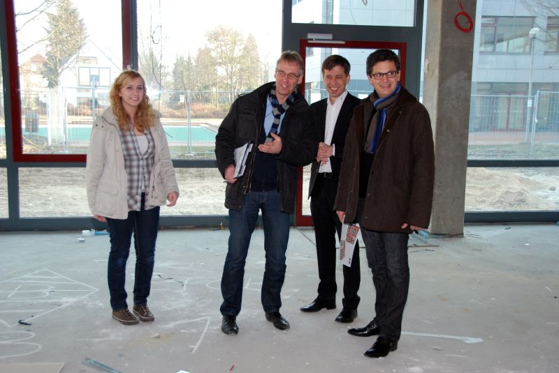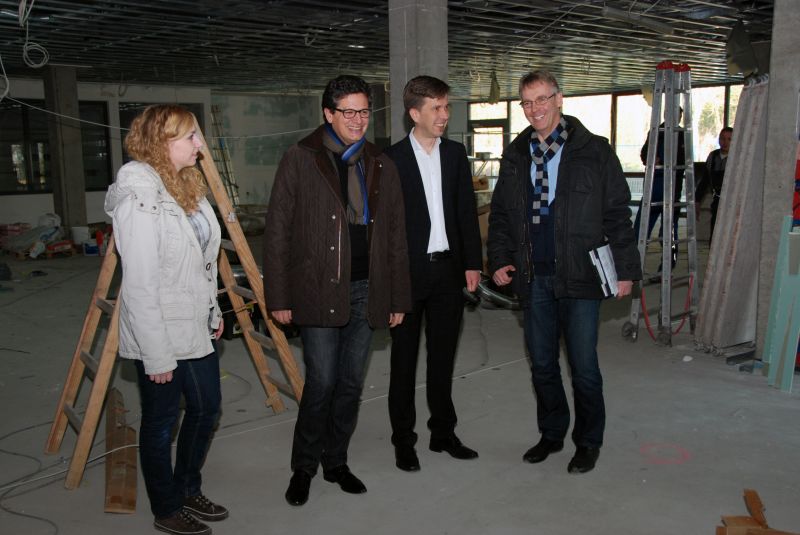 Bürgermeister Pipke, weitere Vertreter der Stadt als Bauherrn, Schulleiter Roth und die Schülersprecherin Maggi Buchmüller besichtigten gemeinsam mit Vertretern der örtlichen Presse den Baufortschritt im Mensabereich und bei den neuen Kunsträumen. Die Musentempel sind kurz vor der Vollendung und wirken bereits äußerst inspirierend. Optisch setzen sie die Linie der neuen NW-Räume fort.