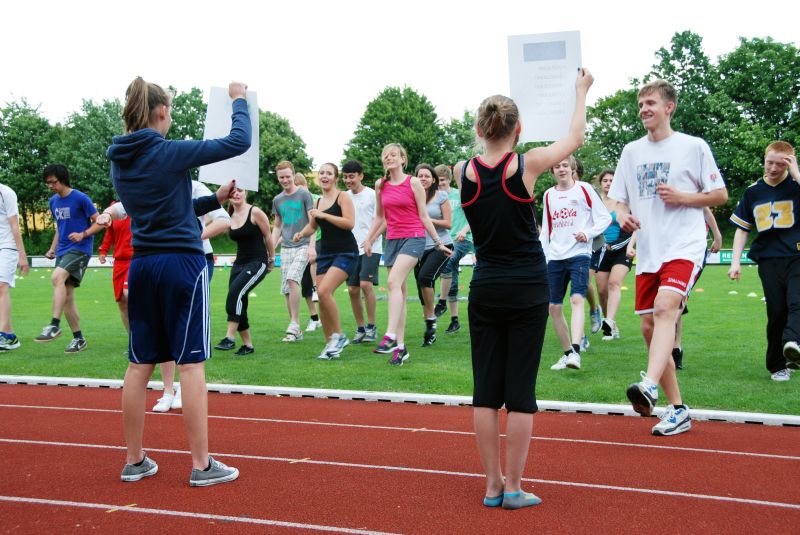 Zur Abschlussveranstaltung kam die Schule wieder im Stadion zusammen. Schließlich traten in verschiedenen Mannschaftsdisziplinen Lehrer gegen Schüler an.