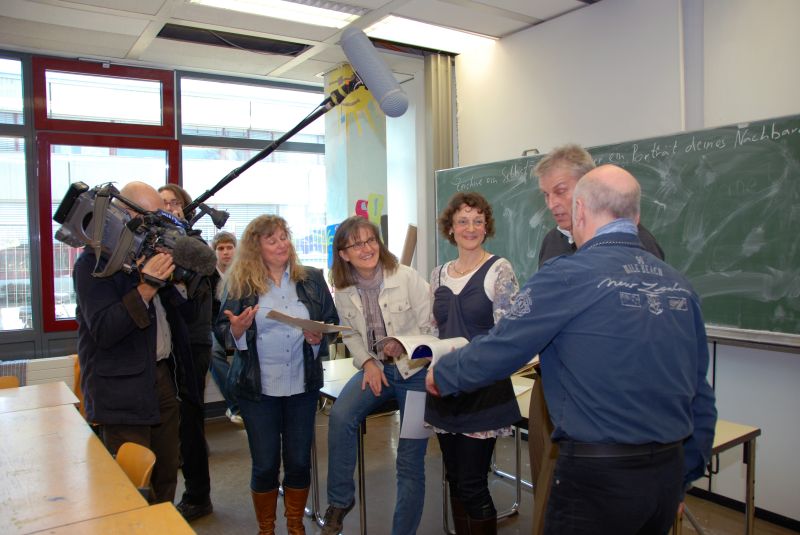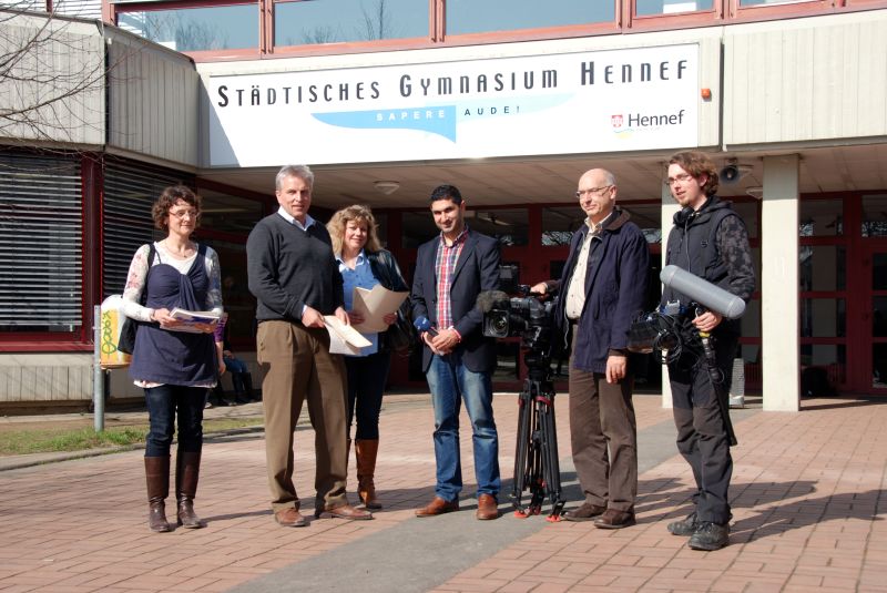 Der Hennefer Journalist Bamdad Esmaili besuchte das SGH mit einem Team vom WDR-Studio Bonn. Drei Ehemalige erhielten vor der Kamera die Früchte ihrer früheren Anstrengungen. Frau Marsfelder, Frau Heller und Herr Dobrowolski nahmen ihre Klausuren aus der Hand von Frau Glaser entgegen und warfen einen kurzen Blick hinein. Später stieß Herr Dr. Gilich dazu, der die Schülerinnen noch aus ihrer aktiven Schulzeit am SGH kannte. Man schwelgte in Erinnerungen und das Team vom WDR hatte mehr Material im Kasten, als es benötigt hätte.
