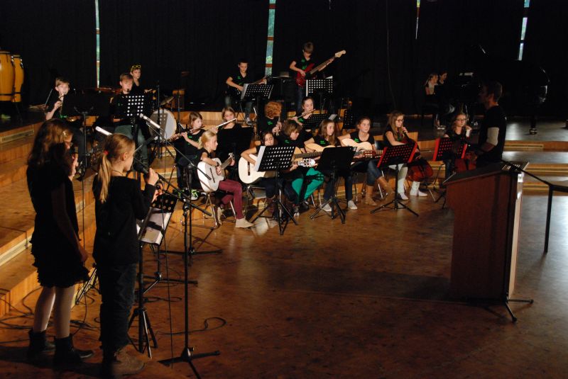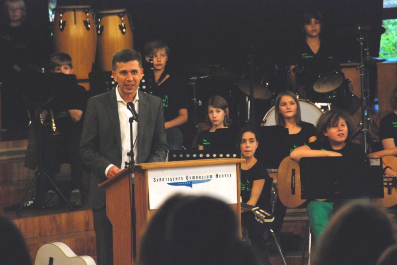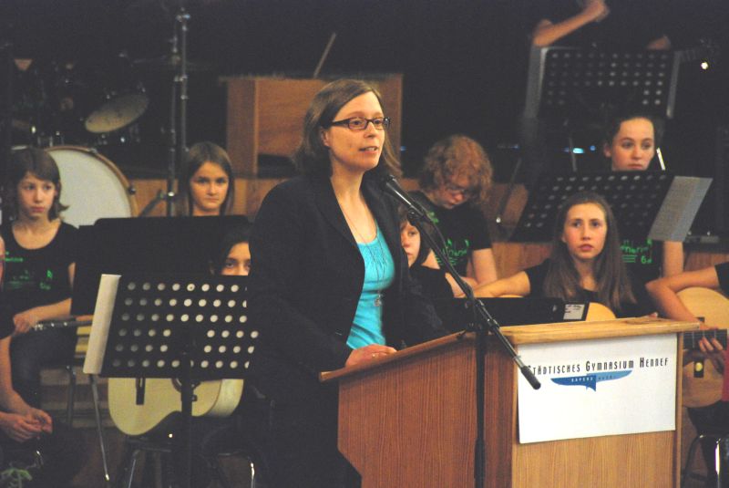 Die Flyers des Jahres 2013 hatten sich also ihre kurze, aber feierliche Zeremonie redlich verdient. Die con brio-Klasse 6d stellte den flotten musikalischen Rahmen, Herr Roth begrüßte die anwesenden Schüler und Eltern und Frau Becker ließ in ihrer Rede Momente des Prüfungstages Revue passieren. Im Namen aller Englischlehrer und -lehrerinnen gratulierte sie der Gruppe und ergänzte mit Blick auf die sich anschließenden englischen Worte der anwesenden Prüferin der Uni Cambridge, Frau Anne Grundy: "Liebe Flyers, wenn Teile des Publikums Probleme haben zu verstehen, könnt ihr vielleicht einfach übersetzen. Wir wissen ja jetzt, dass ihr es könnt!"