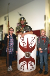 Dazu verwandelte sich die Mensa des SGH für zwei Stunden in eine bunte Römerwelt, in der es viel zu entdecken, zu gestalten, zu spielen, zu fragen und zu erfahren gab. Das Angebot umfasste die Darbietung zweier – fast – echter Römer, Mitglieder der Darstellergruppe Flavii: ein miles gregarius (also ein gewöhnlicher Soldat) in originalgetreuer Ausrüstung und Tertius Mummius Pictor (Tertius Mummius, der Maler). „Friert man nicht an den Beinen?“ fragte ein Mädchen angesichts der bei der Rüstung unbekleideten Beine. „In der Rüstung machte der Soldat nur zwei Dinge: marschieren oder kämpfen – bei beidem friert man nicht“, gab der miles über das Leben eines römischen Legionärs Auskunft und ließ die begeisterten Schülerinnen und Schülern sogar in sein Kettenhemd schlüpfen, um sie das Gewicht spüren zu lassen. Pictor zeigte römische Tafelbilder auf Holz, erläuterte die Schritte zur Herstellung, von der Anfertigung der Materialien wie z.B. Zinnober, über das Reiben der Farbe bis zur Maltechnik.Die Schülerinnen und Schüler konnten hier mit nach antiker Technik angefertigter Tinte und einer Feder aus Bambusrohr ihren Namen auf Pergament schreiben.
