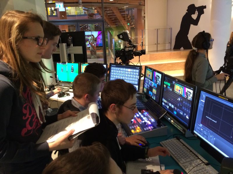 Nach einer kurzen Einführung vom Studio zwei-Team des WDR wurden alle Aufgaben verteilt, die bei der Produktion einer Fernsehsendung wichtig sind. Nach Belieben hatte jeder die Möglichkeit, in den Aufgabenbereich herein zu schnuppern, für den er oder sie sich besonders interessiert. Wir staunten nicht schlecht, denn von manchen Berufen hatten wir noch nie in unserem Leben gehört. Schließlich hatten alle einen für sie passenden und zufrieden stellenden Beruf gefunden und es konnte endlich losgehen. Im technischen Bereich des Studios wurden die für die technischen Berufe zuständigen Schüler vor Computer mit hochkompliziert aussehenden Knöpfen und Tasten gesetzt. Die technischen Berufe waren: