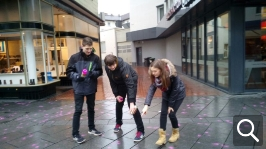 Wie es bundesweit mit der Kampagne weitergeht, wurde beim Abschluss- und Reflektionstreffen in Gießen diskutiert. Zuerst konnten wir als Hennefer Team unsere Projekte präsentieren und haben von den Aktionen der anderen Schulen erfahren. Dann sollte noch mal ein Zeichen gesetzt werden, in der Gießener Innenstadt wurde jedes Kaugummi auf der Einkaufsstraße angesprayt. Der Hintergrund ist, dass die Passanten sensibilisiert werden für die Frage: "Wie gehe ich mit meiner Welt um?". Zwar sind Kaugummis nur ein kleiner Teil unseres alltäglichen Konsums, trotzdem kauen die meisten Jugendliche Kaugummis und werfen sie achtlos auf die Straße. Genauso achtlos gehen wir mit dem Weltklima und unserer Umwelt um.