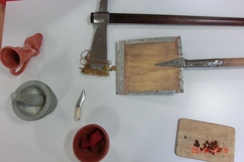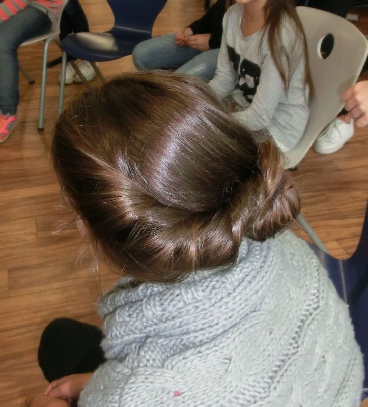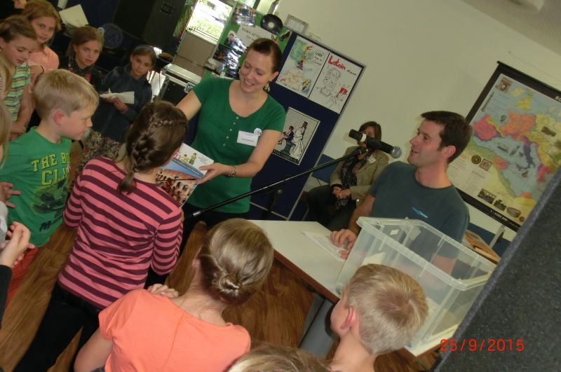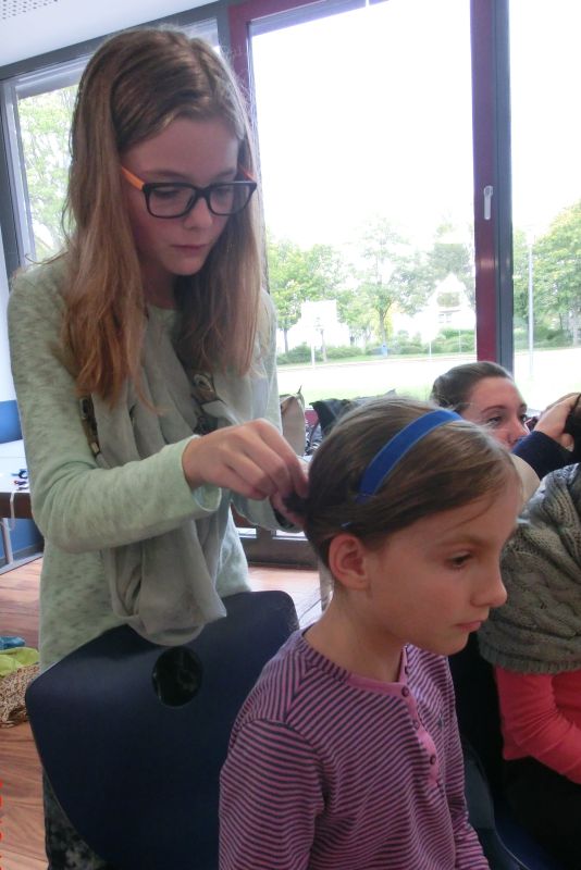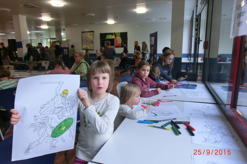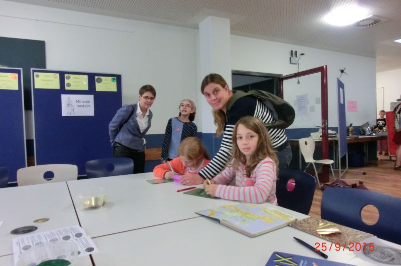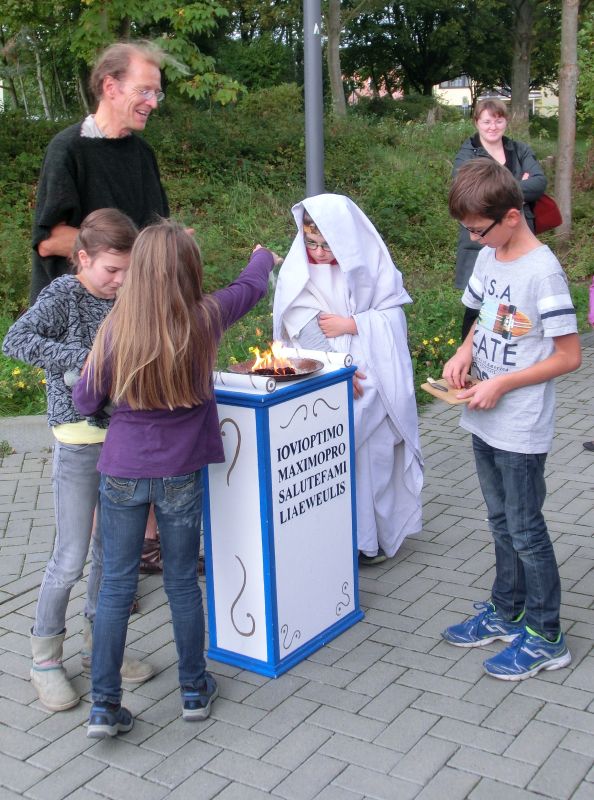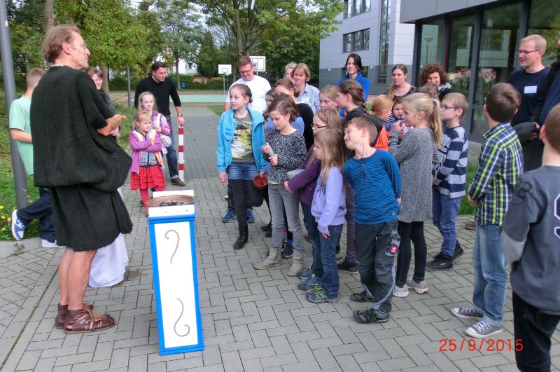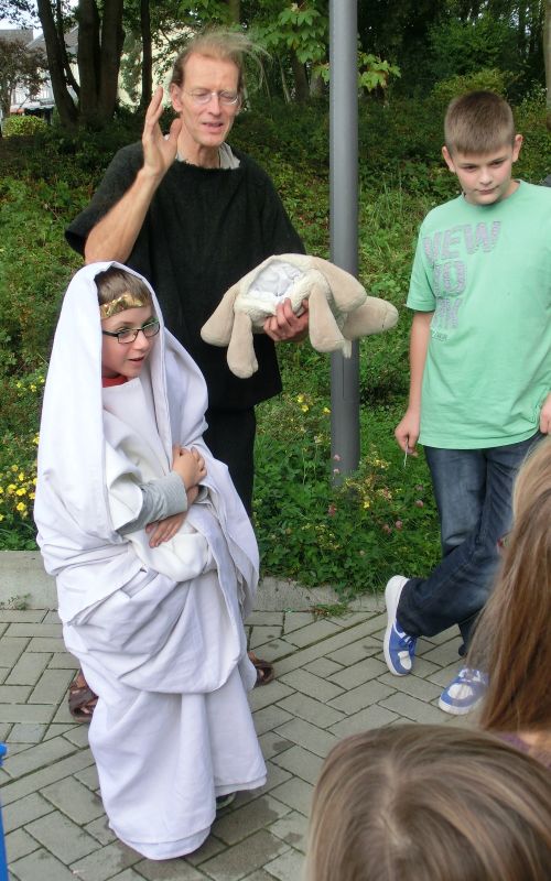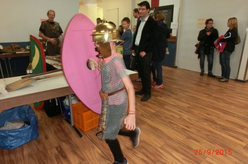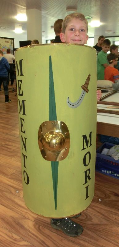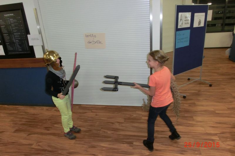 Die SchülerInnen konnten an verschiedenen Stationen die lateinische Sprache kennenlernen, mit einem Sprichwortquiz erste Vokabeln erschließen, römische Spiele ausprobieren oder Münzen mit einem Kaiserportrait basteln. Sehr beliebt war die Frisierstation, wo sich die Mädchen von Lateinschülerinnen des Jg. 8 nach Mode der römischen Damen frisieren lassen konnten. Die Jungen hingegen zog es v.a. zum Mitmachvortrag des Römerdarstellers Kai Ingo Weule, wo sie zum Thema „Römisches Soldatenleben“ nicht nur viel erfuhren, sondern einiges sogar am eigenen Leibe ausprobieren konnten. So merkten sie beim Waffenlauf nach zehn Runden das zu tragende Gewicht deutlich. Auch bei den weiteren Themen scharten sich die Kinder dicht um Weule, der zum krönenden Abschluss mit den Teilnehmern einen Gladiatorenkampf nachstellte.