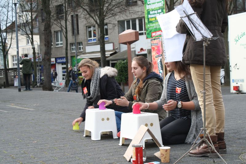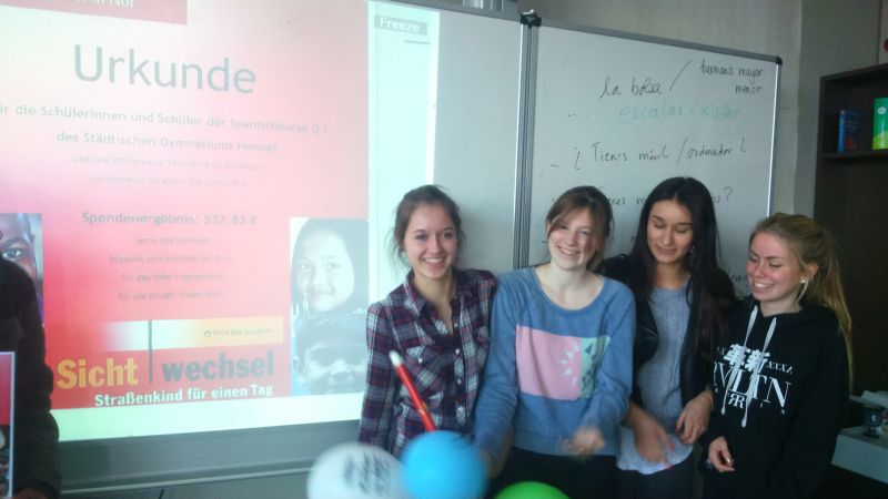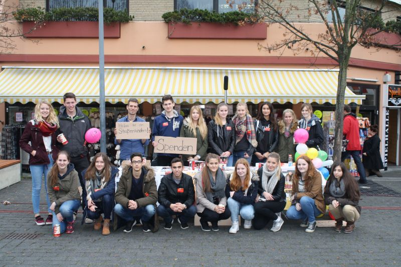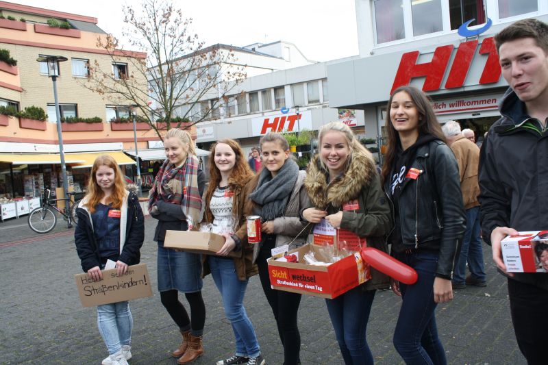 Unter dem Motto „Straßenkind für einen Tag“ begaben wir, die Spanischkurse der Q1 des SGH, uns am 5. November zum Hennefer Marktplatz. Unsere Ziele dabei waren das Spendensammeln für Straßenkinder weltweit und gleichzeitig mit dieser Aktion auf die schwierige Situation der Straßenkinder aufmerksam zu machen. Das gesammelte Geld geht zunächst an die Organisation terre des hommes, welche das Geld zu Büros in verschiedenen Ländern schickt und damit den Straßenkindern vor Ort hilft. terre des hommes organisiert die Aktion „Straßenkind für einen Tag“ jährlich im November und bundesweit gehen dafür Schülerinnen und Schüler auf die Straßen um zu diesem Anlass Geld zu sammeln.
