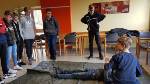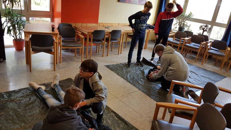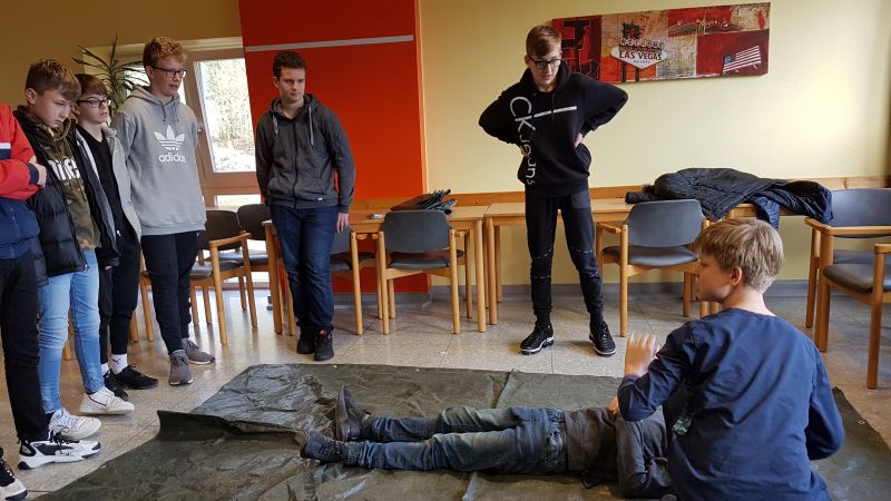 Am zweiten Tag brachten die Sanitäter verschiedene Elemente der Erste Hilfe den Sporthelfern bei, beispielsweise stabile Seitenlage oder Wiederbelebung. Gegen 13:00 machten wir uns wieder auf den Weg zurück nach Hennef.