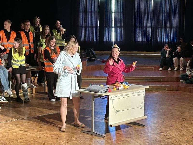 Besonders die beiden StufenleiterInnen Frau Bohlmann und Frau Ucal hatten an diesem Vormittag nichts zu lachen, wurden sie doch unter Polizeisound als Gefangene in das Pädagogische Zentrum geführt, wo sie auf einem Sofa so plaziert wurden, dass eine Flucht unmöglich wurde.
