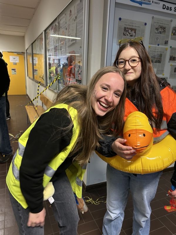 Doch auch freiwillige Beiträge verwandelte das stellenweise zu einer Kampfarena mutierte PZ in eine stille und nachdenkliche Szenarie, welche die Bedeutung dieses allerletzten Schultags für Q2 deutlich machte, die acht Jahre Freud und Leid am SGH zusammen geteilt und unvergessliche Situationen dort erlebt haben: Frau Bohlamann und Frau Ucal, welche zuvor bei dem Spiel "wer würde eher" mit dem Rücken aneinander sitzen ihre Schuhe heben und den anderen einschätzen mussten, führten jetzt in einer entsprechenden Aufmachung das Entenlied aus der Sesamstraße auf, das ihre Rolle als "Stufeneltern" unterstrich und dem Ganzen eine familiäre Note verlieh.