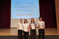 Lea Kosa, Amelia Voss, Rusi Todorinov, Tobias Motz und Emma Bork griffen dabei ihre Erkenntnisse auf, die sie während des von der Stadt Hennef organisierten „SpeedDebating“ gewonnen hatten und informierten in diesem Zusammenhang über die Ideen und Vorstellungen der verschiedenen Kandidatinnen und Kandidaten. Bei der Preisverleihung, die am 8. Juli im “Haus der Geschichte” in Bonn stattfand, wurde die Gruppe ausgezeichnet: In der Kategorie “Podcast” errangen die fünf Schülerinnen und Schüler den ersten Platz und erhielten damit nicht nur ein Preisgeld in Höhe von 300€, sondern auch eine Einladung in den Landtag nach Düsseldorf. Gleichzeitig setzten sie damit mit vielen anderen Schülerinnen und Schülern aus Bonn und dem Rhein-Sieg-Kreis ein Zeichen für die Demokratie und formulierten ein klares Statement: “Du bist erste Wahl! Geh wählen! Ohne dich keine gute Zukunft in Bonn und im Rhein-Seig-Kreis!”