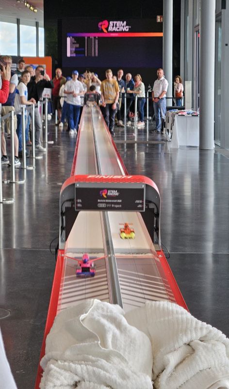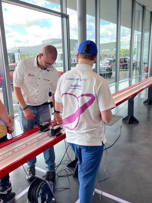 Am Freitag standen wir voller Spannung vor dem riesigen Veranstaltungsgebäude. Wir waren nicht nur das erste Team vor den Toren von Audi, sondern auch das Team, das als erstes seine Registration abschloss. Nach der Abgabe aller Wettbewerbsunterlagen und unserer Autos bereiteten wir den Teamstand-Aufbau vor. Alle dafür benötigten Materialen hatten wir zuvor bereits in beschrifteten Kisten verstaut. Um uns herum tummelten sich Teams aus ganz Deutschland, Werkzeugkisten, Banner, Teamstandelemente und Vieles mehr, und wir waren mit unserem Stand mittendrin in dem bunten Treiben.