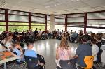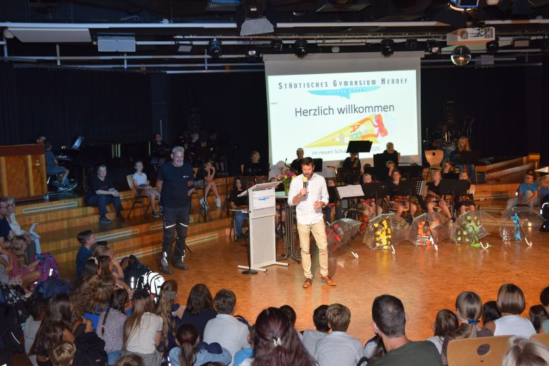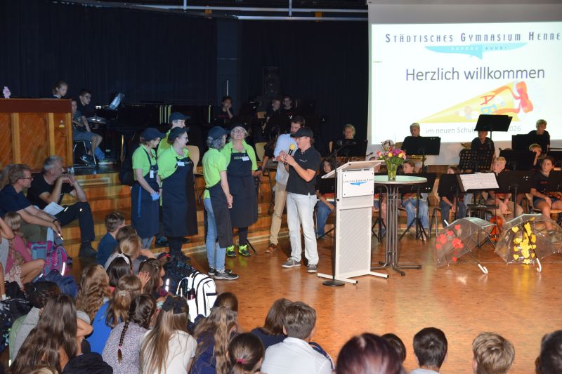 Der Tag begann um 10.15 Uhr mit einem festlichen Einschulungsgottesdienst in der Kirche St. Simon und Judas, an dem das Klassenlehrerteam teilnahm. Anschließend fand um 11.20 Uhr die feierliche Aufnahmeveranstaltung im Pädagogischen Zentrum (PZ) statt. Dort richteten die Schulleitung, Frau Glaser und Herr Heiseke, der Erprobungsstufenkoordinator, Herr Braun, die KlassenlehrerInnen und die Paten herzliche Willkommensworte an die 143 neuen Schülerinnen und Schüler.